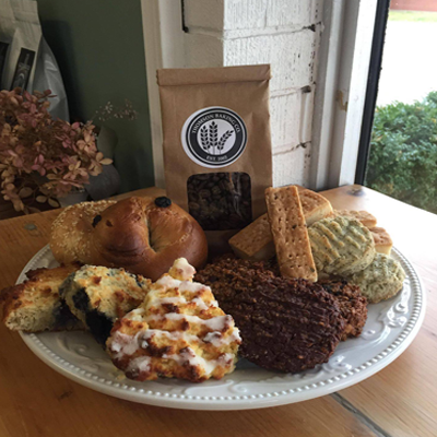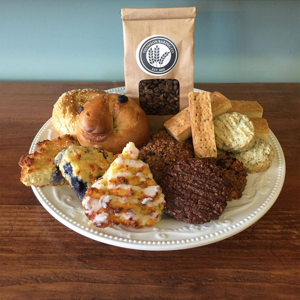 Platter contains: 2 sticks of traditional shortbread, 2 sticks of lemon SB, 1 stick of Lavender SB, 2 London Fog SB Cookies, 1 each of keto lemon, blueberry and blackberry scones. 1 each of gluten-free & vegan breakfast cookies (double chocolate peanut butter, cherry almond, cranberry pumpkin seed, and cherry chocolate) Small package of whole Coffee beans (2 cups) 1 Sesame and 1 cinnamon/raisin bagel.